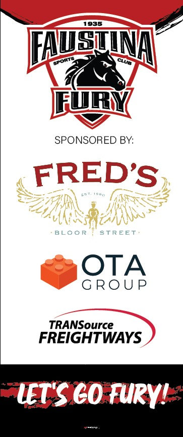 Aluminum Retractable / Collapsible Banner Stands Made from high quality 10 mil Premium Vinyl. Measuring 33” x 81” 4/0 (full color front: CMYK). Banners come pre-installed in hardware and include an accompanying carrying cases for easy transportation and setup. Price includes up to 1 hour of design and set up. All sponsor logos must be supplied in high quality files (ie: CMYK, 300dpi or vector format)