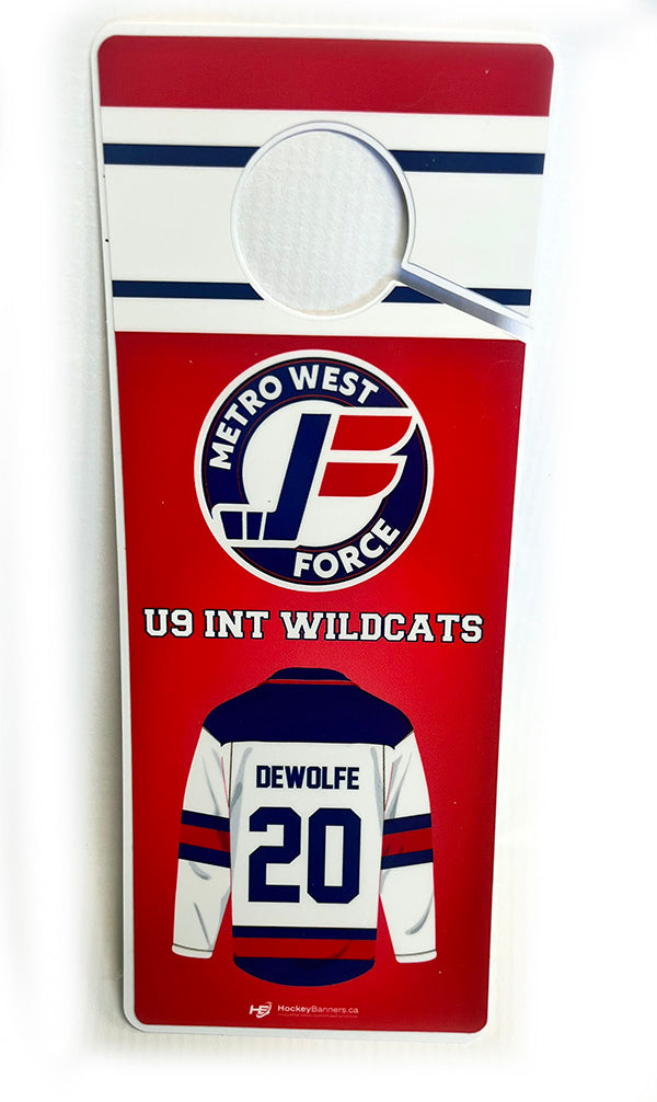Make your team stand out with our hotel room door hangers. Every hanger can be customized with your team roster with individual player names and numbers. Or choose just your team logo and division. These are a must-have for your next tournament. Door hangers are made from PVC with a hole for hanging. Printed and UV laminated for durable usage.